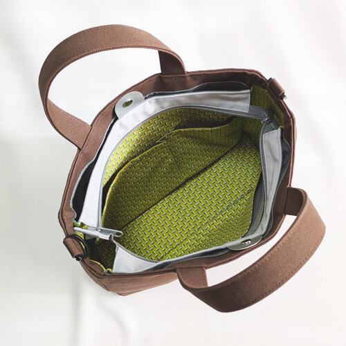バッグ上部にはDカンを付けてありますので、お好きなショルダーストラップで肩掛けとしてもお使いいただけます。
